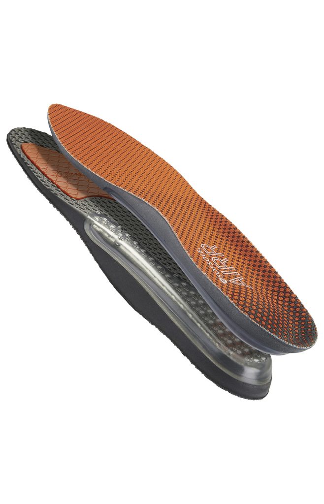 A palmilha Airr® apresenta uma câmara de ar encapsulada no calcanhar e gel de polímero na parte anterior da palmilha.