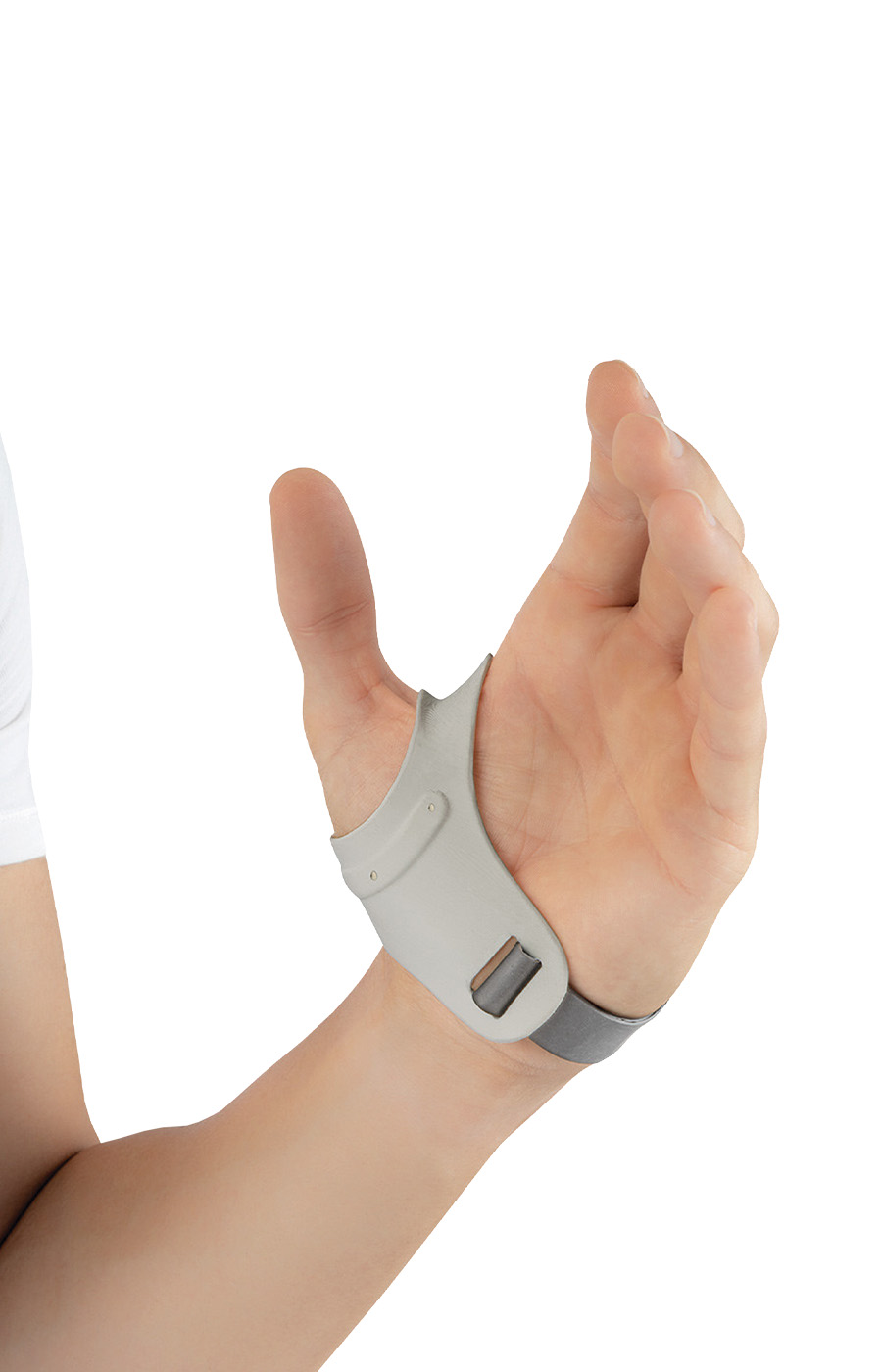 Órtese para posicionamento e estabilização do polegar em posição natural, permitindo a livre mobilidade dos demais dedos e garantindo a funcionalidade da mão. Design com dupla injeção de materiais, oferecendo diferentes níveis de rigidez.